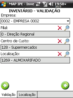 - Inventário: informa-se na tela de Validação os dados que devem ser validados quando for efetuada a leitura da plaqueta, isto é, por exemplo, a filial, localização, centro de custo, etc. Quando a plaqueta é lida, o sistema verifica se o cadastro do bem confere com os dados da validação. Conforme o parâmetro mostra mensagem informando que o dado é diferente, ou altera automaticamente esse dado no cadastro do bem. Com o cadastro da plaqueta na tela, podem-se alterar várias informações conforme configurado anteriormente, como por exemplo: filial, localização, estado do bem, centro de custo, descrição, marca, modelo, número de série.
